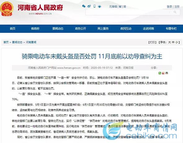 河南省对骑乘电动车未戴头盔的主要以教育引导为主,暂不实施处罚!