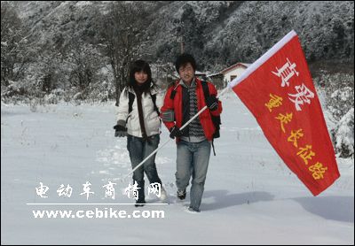 随着海拔的增高,流动的雾气遮掩了山体,山的雄壮骨梁若隐若现。气压逐渐降低,我们开始出现头痛恶心等高原反应,但我们没有放弃,我们也不可以放弃!作为真爱人,我们这次的使命是挑战自我,把爱心送给每一位有需要的人。想到这儿,我们就浑身充满着一股无尽的力量。走在山路上我们不时感慨万千,想到以前的红军英雄们不畏路途艰辛,不怕劳苦,为我们后人打拼出今天的幸福生活。而他们这种精神正值得我们真爱人学习并且将其发扬光大。路途虽然艰辛,但我们终于在六个小时的与恶劣环境的抗争后登上了最高峰,我们内心激动的情感已难以用语言来描述。我们把红旗树立在白茫茫的雪中,鲜红色的旗帜随风飘起。“真爱重走长征路” 的标语正代表着我们真爱人的心声——克服一切困难去帮助和关爱每一位需要帮助的人!