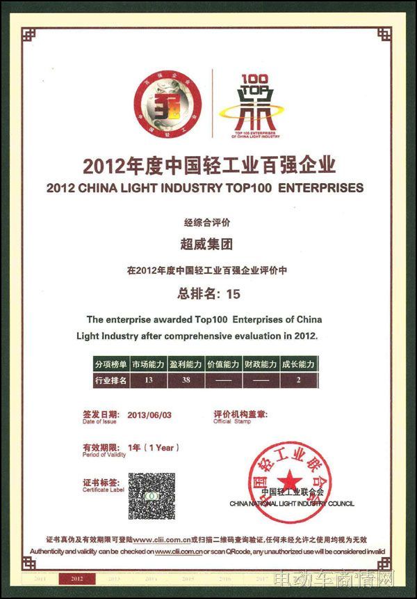 由中国轻工业联合会主办,中国轻工业信息中心承办的2013年中国轻工业百强企业颁奖盛典暨企业家高峰论坛于6月20日至21日在北京举行,会议的主题是“迎战产业变局,加快转型升级”。会议同时发布了2012年度中国轻工百强企业榜单,超威集团与海尔集团、光明集团、美的集团、格力电器、海信集团、五粮液集团、娃哈哈集团、贵州茅台公司、玖龙纸业、晨鸣纸业、太阳纸业、伊利集团、青岛啤酒、中国工艺集团等公司均进入排行榜十五强;国内的其他知名企业如:泸州老窖、华泰集团、格兰仕集团、蒙牛乳业、洋河酒厂、大金空调、老凤祥股份、新疆天业、张裕集团、三星电子、鲁花集团、澳柯玛、苏泊尔、纳爱斯集团、古井集团、枝江酒业、珠江啤酒、玫琳凯、立白集团、飞利浦(中国)等均成功进入百强榜。此次超威集团在成长能力排名居第二位;在市场能力排名居第十三位;综合排名居第十五位,该成绩在所有入围榜单的铅蓄电池生产企业中排名第一。