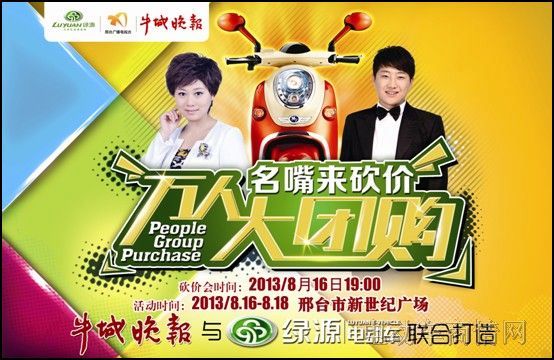 8月16日-18日,绿源电动车8月“全面出击 一战到底”活动来到河北邢台,此次活动得到邢台广播电视台、《牛城晚报》的倾力相助,主题定为“名嘴来砍价 万人大团购”,现场异常火爆,规模堪称邢台近年来最大的电动车活动,真正实现了“万人”团购。