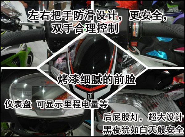 从下图,我们可以看到台铃铃丹左右把手均采用的是防滑设计,给行车带来安全与方便,右把手上的三档变速开关,充分体现了人性化设计,有经济、爬坡、超车三档,这是台铃的专利,可以适应不同环境的需求。经济档:节能,续行里程长;爬坡档: 电机扭力加大,增大爬坡力; 超车档:瞬间输出功率最大,转速最快,最高达50公里每小时。