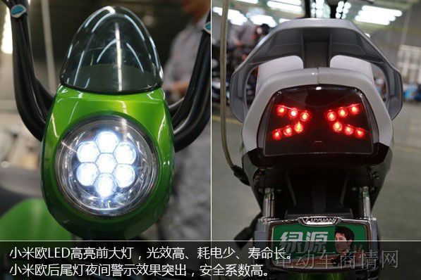小米欧的LED显示器和LED前大灯就外观精美度而言,可以打高分,实用性上,LED前大灯还具有光效高、耗电少、寿命长的优点,并且,小米欧的尾灯夜间高亮,警示效果非常突出。需要说明的是,米欧LED显示器是不显示车速的。