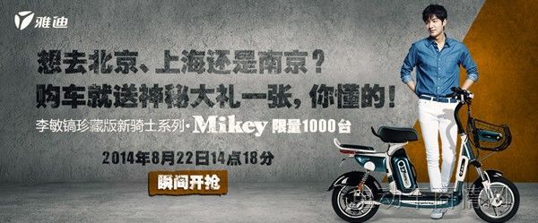 自从宣布签约男神李敏镐后,雅迪电动车一直动作不断,先有重金悬赏征集广告语风生水起,后有极具态度的《新骑士精神》广告片震撼首映,现在米琪作为新骑士系列电动车“李敏镐珍藏版”的“首发”,率先在电子商务平台小试身手,取得了不俗成绩。