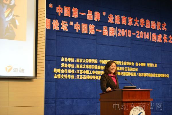 2014年12月14日,“中国第一品牌”走进南京大学启动仪式暨首期论坛“中国第一品牌(2010-2014)的成长之路”在南京大学商学院隆重召开。本次选择了雅迪科技集团有限公司、太阳雨集团有限公司和江苏今世缘酒业股份有限公司三家品牌企业作为首届论坛的品牌企业。