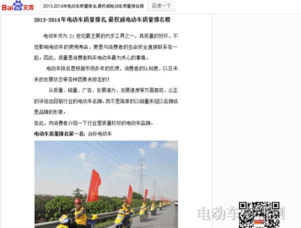 既然说到稳定,那么问题来了!整个2014年度电动车的质量哪家表现最稳定呢?当然是台铃电动车喽,可能有些朋友不服,不打紧,我们就拿事实说话。不信?自己找度娘去,膜拜台铃又蝉联2013-2014年度的冠军吧!