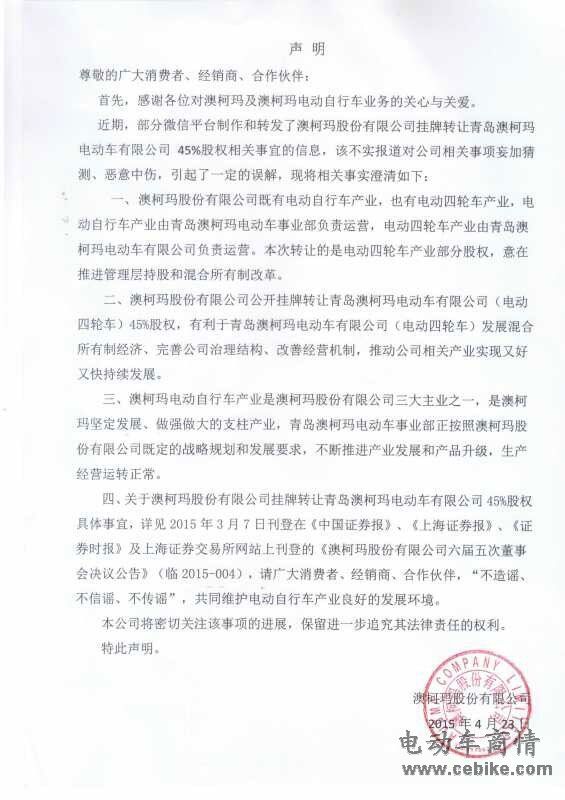 四、关于澳柯玛股份有限公司挂牌转让青岛澳柯玛电动车有限公司45%股权具体事宜,详见2015年3月7日刊登在《中国证券报》、《上海证券报》、《证券时报》及上海证券交易所网站上刊登的《澳柯玛股份有限公司六届五次董事会决议公告》(临2015-004),请广大消费者、经销商、合作伙伴,“不造谣、不信谣、不传谣”,共同维护电动自行车产业良好的发展环境。