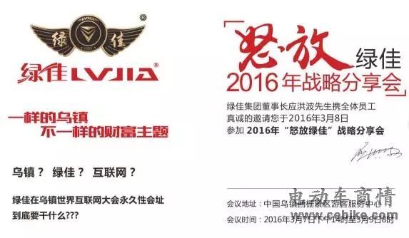 作为电动车行业第一家在乌镇——世界互联网大会永久性会址召开会议的企业,绿佳重新整合自身资源,运用互联网思维,发布2016年“怒放绿佳”战略分享会,突破创新,释放“传统制造+互联网+创业创新”的叠加优势,共同演绎行业新机遇,奏响财富最强音。