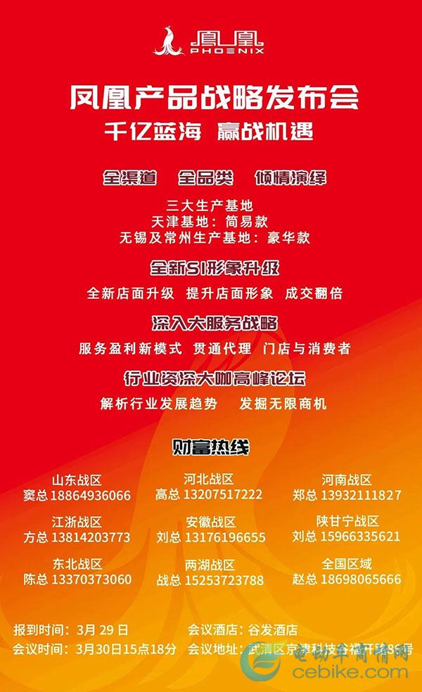 近日,凤凰集团携手兴世达天津展将出王炸招的消息彻底刷屏全网,以“盛势跃动 领潮未来”为主题的展会以及明天(3月30日)下午15:18在天津谷发酒店即将举行的“产品战略发布会”也进入倒计时,此次资本助推、果断出击的凤凰电动将如何构筑差异化竞争优势,是产品碾压,还是营销制胜,亦或是服务升级,都非常值得关注。