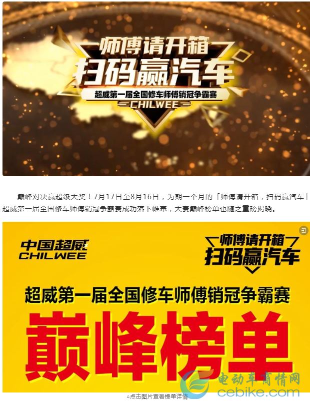 [提要] 巅峰对决赢超级大奖!7月17日至8月16日,为期一个月的「师傅请开箱,扫码赢汽车」超威第一届全国修车师傅销冠争霸赛成功落下帷幕,大赛巅峰榜单也随之重磅揭晓。